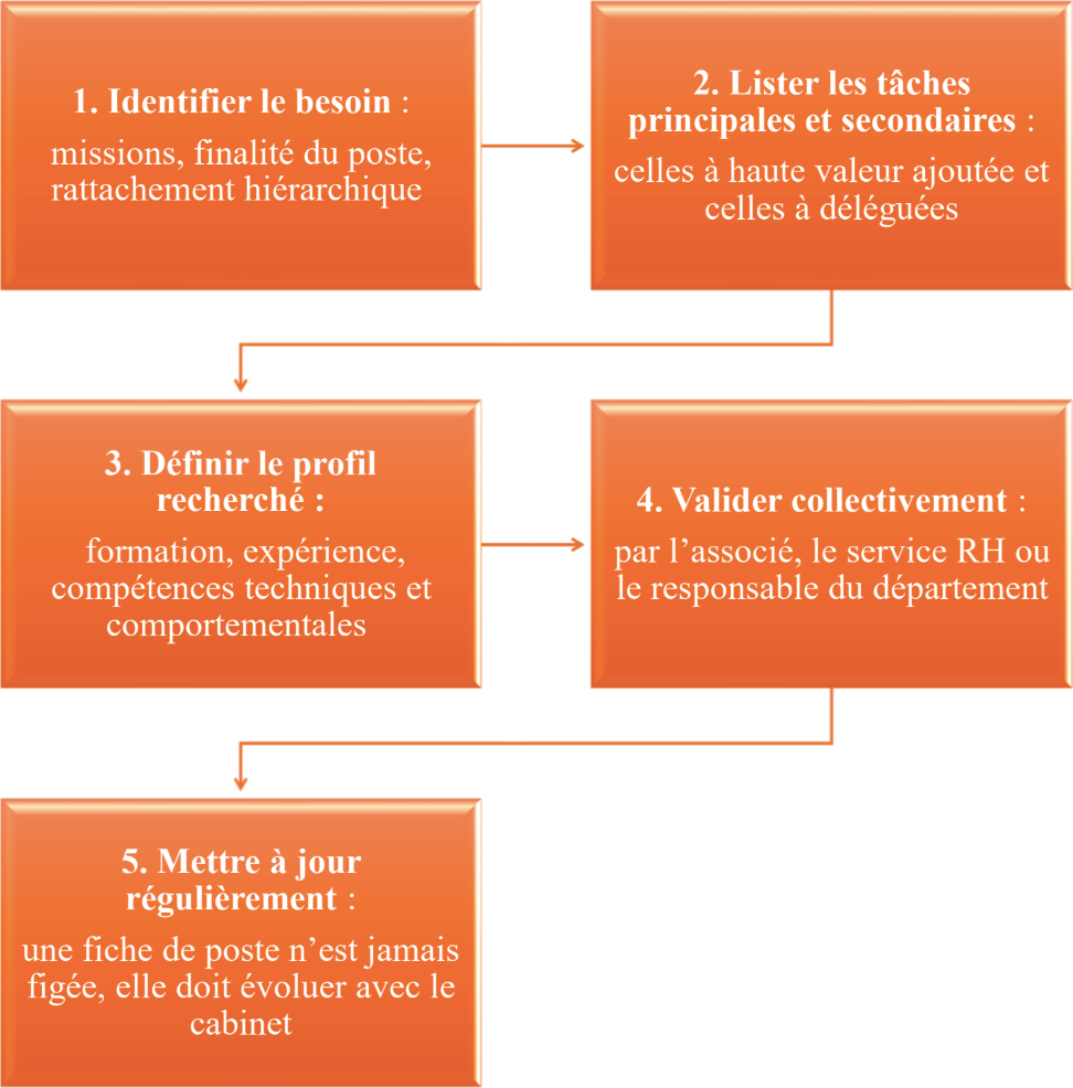 Dans les cabinets les plus structurés, chaque collaborateur participe même à l'élaboration de sa propre fiche de poste, via un questionnaire interne. Ce processus collaboratif renforce la transparence, la responsabilisation et l'engagement de chacun.